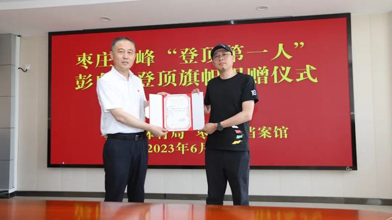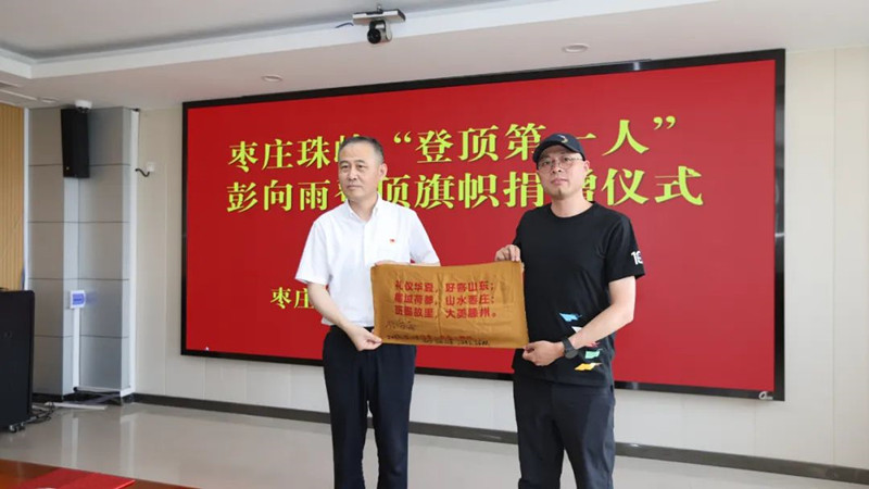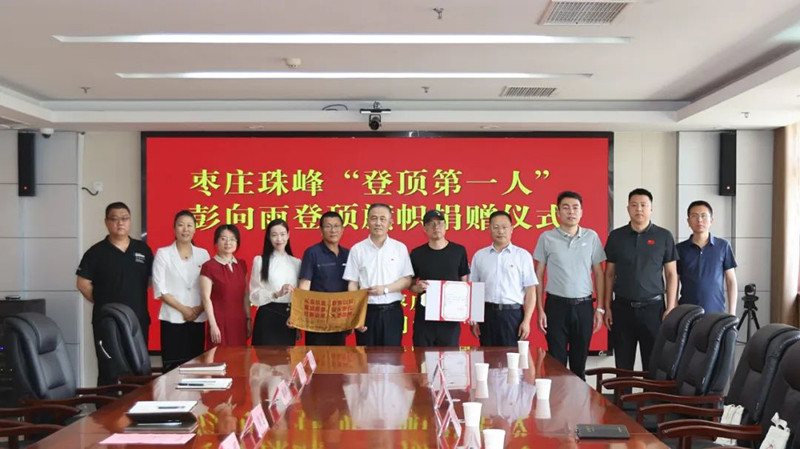 棗莊珠峰“登頂?shù)谝蝗恕迸硐蛴晗蚴袡n案館捐贈(zèng)旗幟